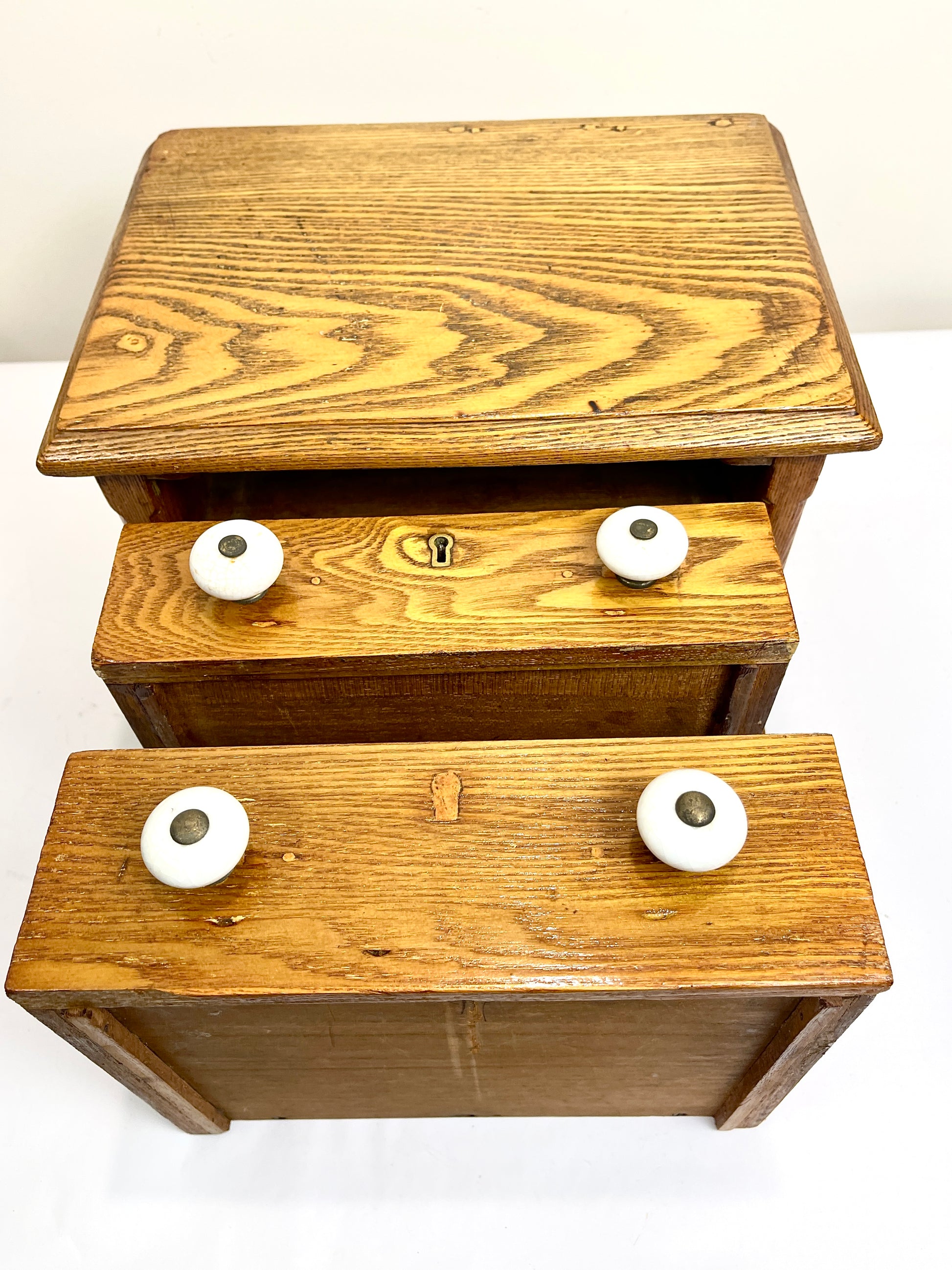 Antique two-drawer oak spool cabinet - possibly hand crafted. Traditionally used in general stores or homes to organize spools of thread for sewing. It’s quite charming with its porcelain knobs and original lock plates. The locks have a crown and letters VT along with the words Secure Patent. One key opening has been filled in but it still shows well and is a lovely piece. Wonderful for display or to use for all types of storage – sewing, keepsakes, keys, jewelry, office or notions, etc. Could also be nice to use as part of a coffee bar.