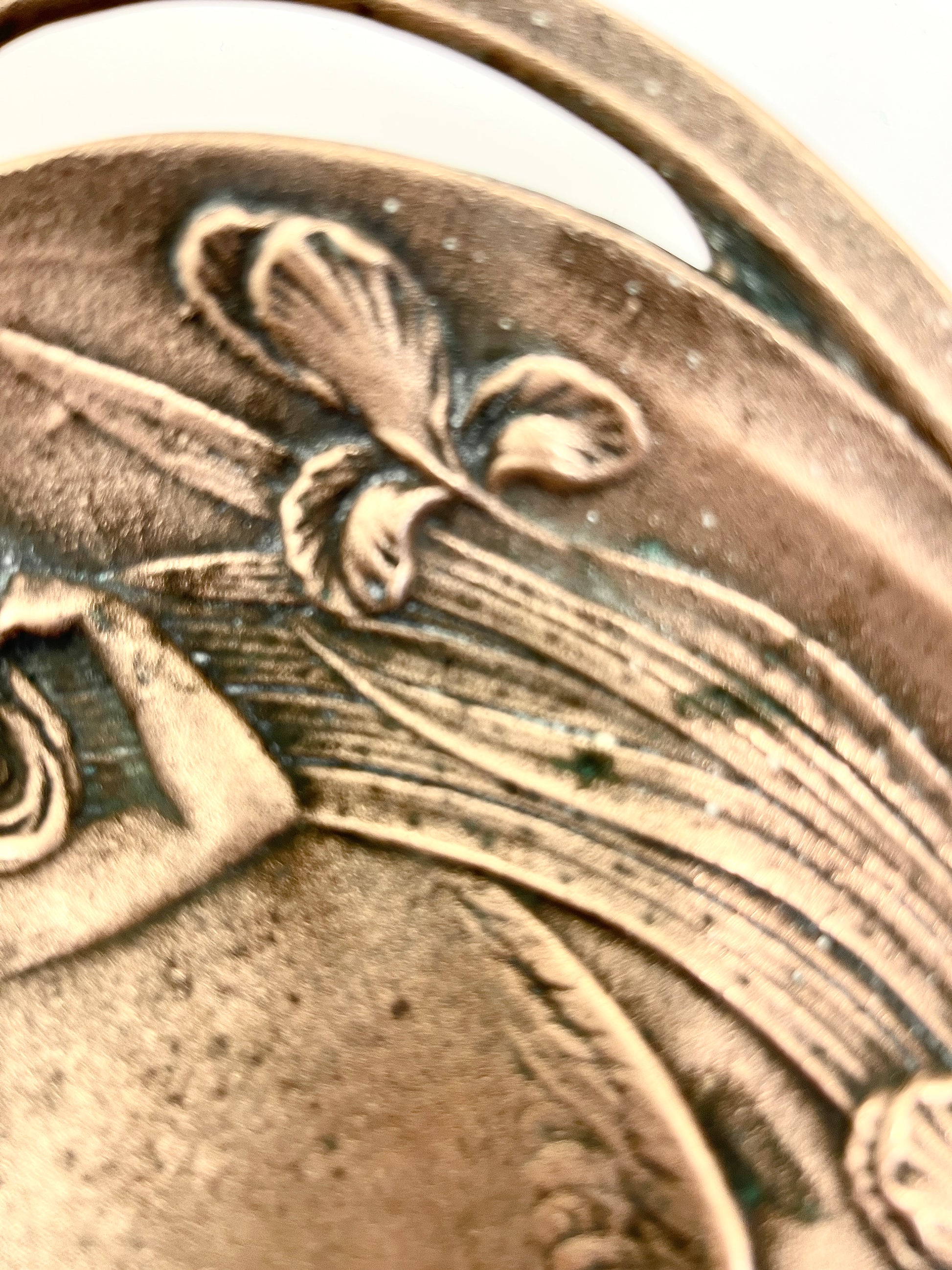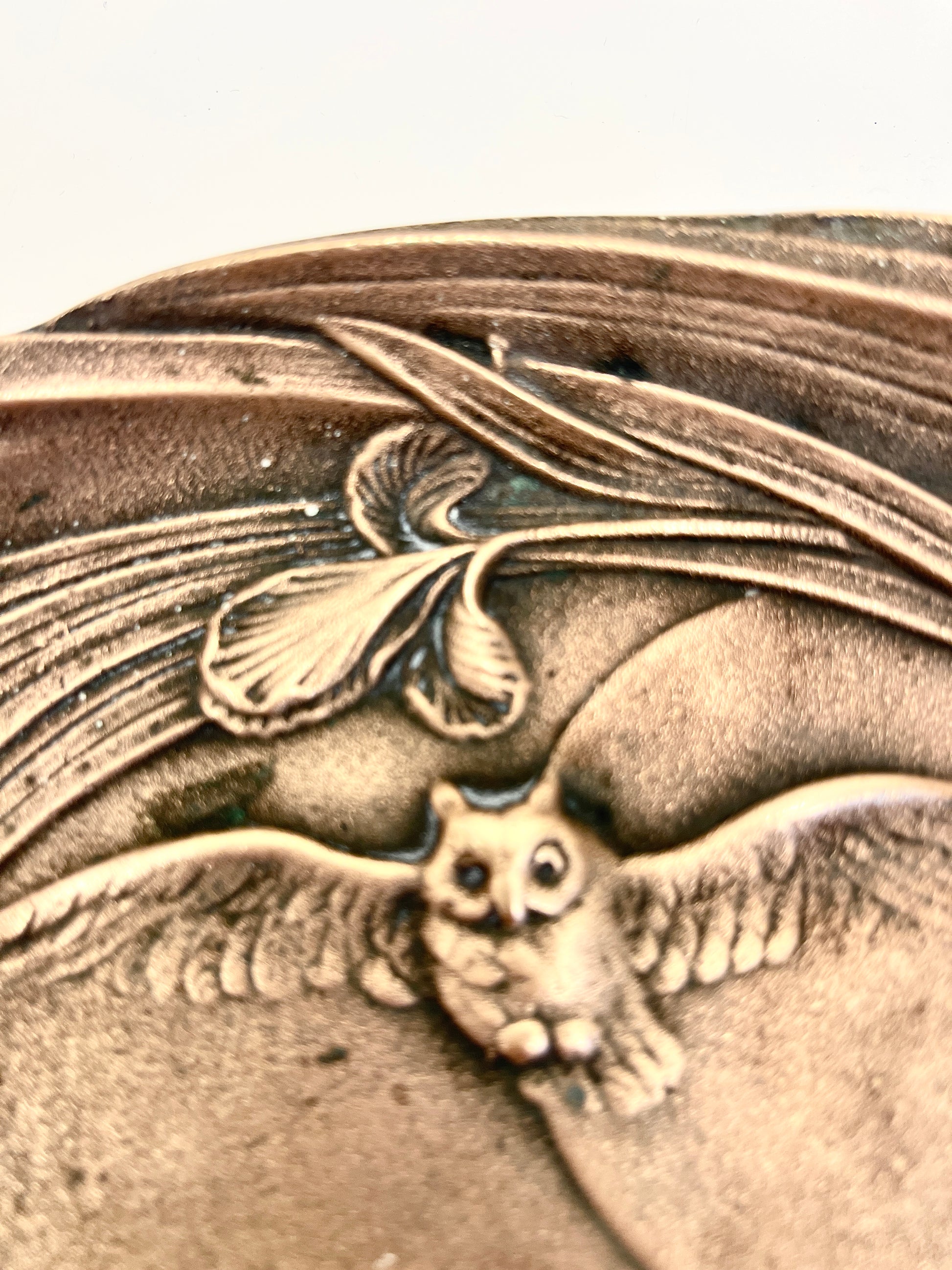 Lovely antique Art Nouveau solid bronze two-handled dish features a maiden surrounded by iris flowers, with a flying owl and moon in the background. The addition of an owl with outstretched wings flying over the moon depicts the connection between the maiden and the natural world. The raised relief, flowing lines and naturalistic forms are characteristic of the Art Nouveau movement. It is marked "Steller" on the front just above the owl's wing.