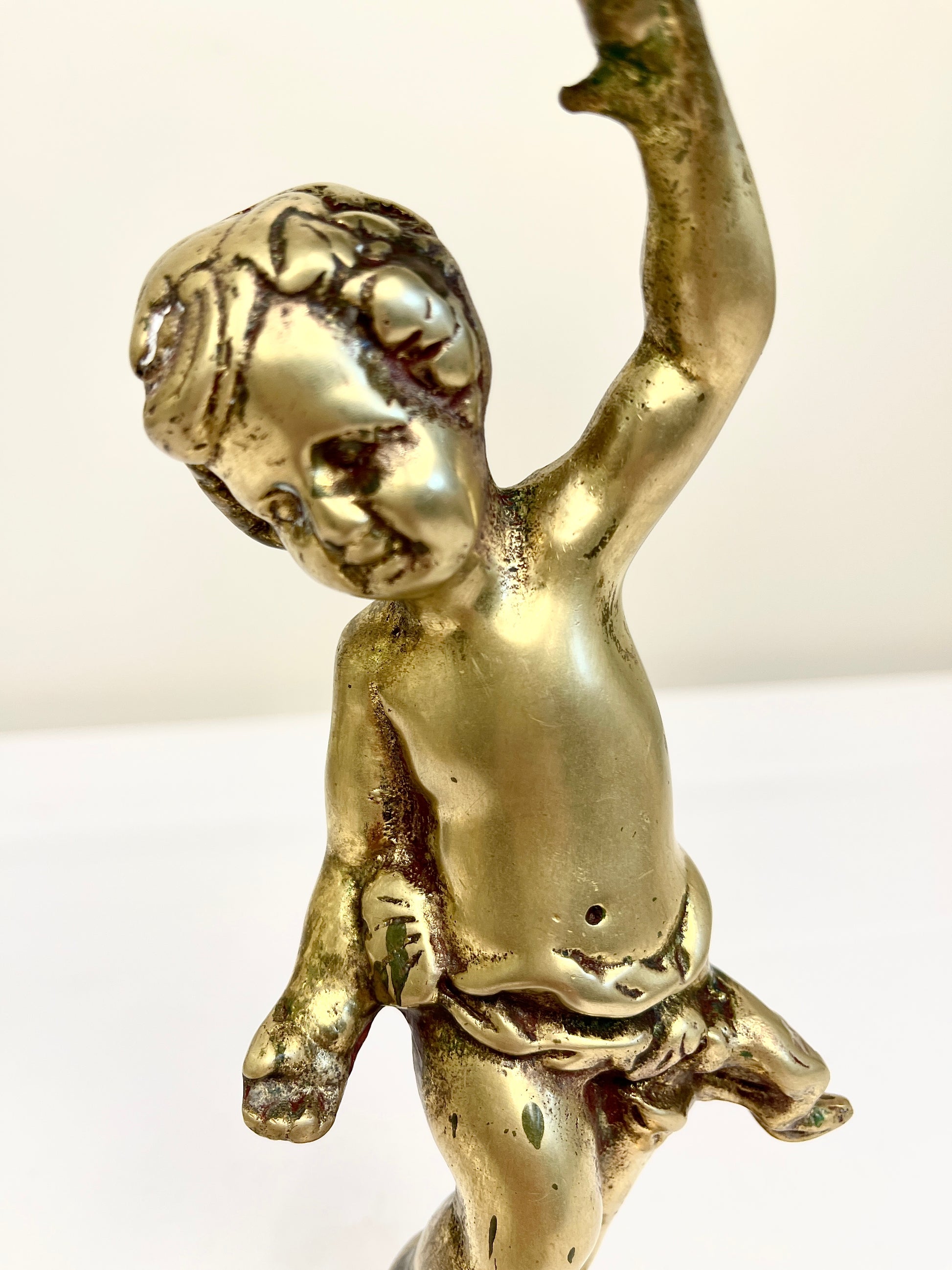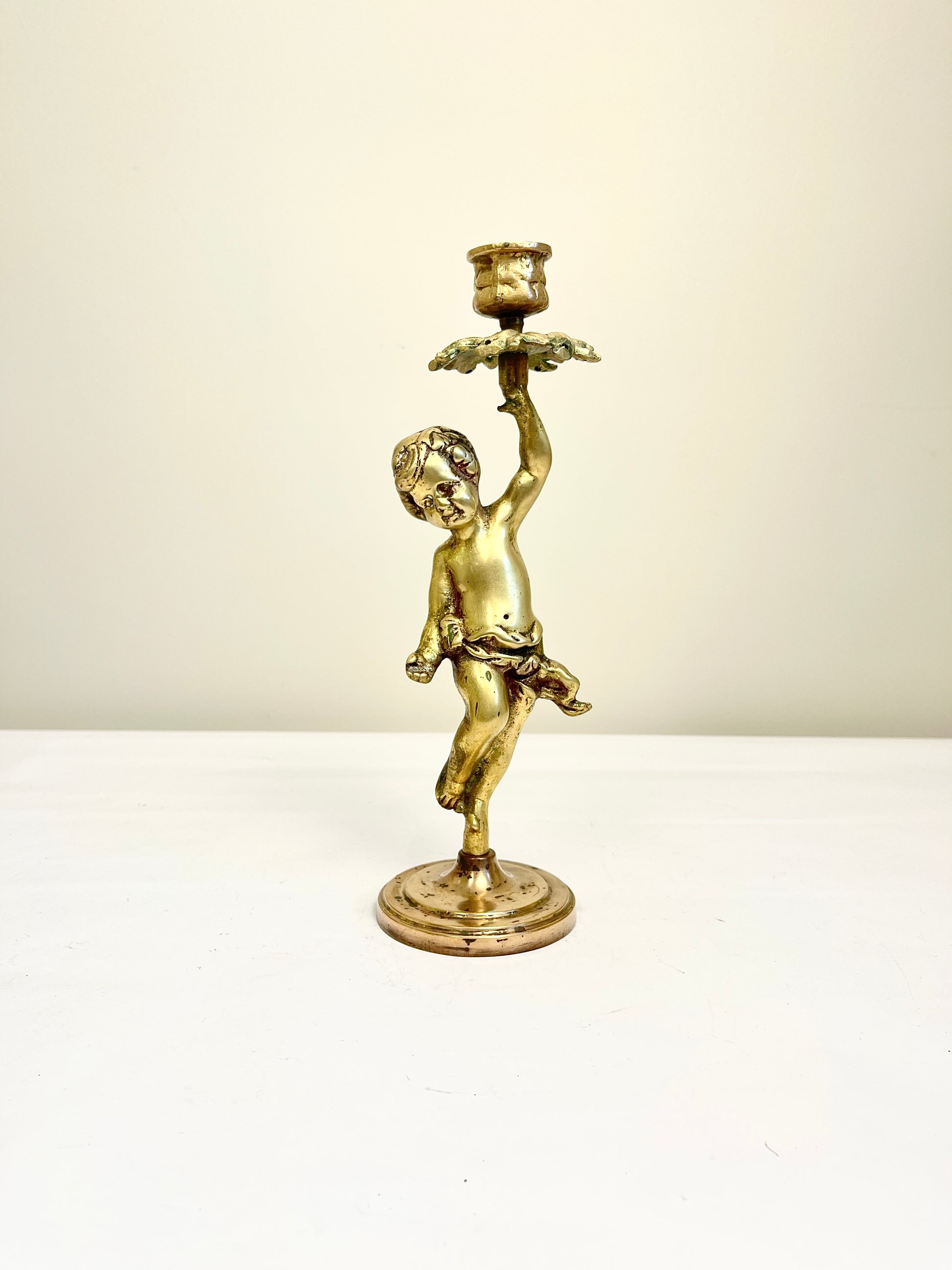 Rare and beautiful antique or antique bronze cherub candle holder. VERY HEAVY, sturdy and sits flat - the cherub is holding an ornate candle cup with a raised arm and has toga-like fabric wrapped around his middle. It has lovely detail and is sure to be a wonderful accent piece in any home.