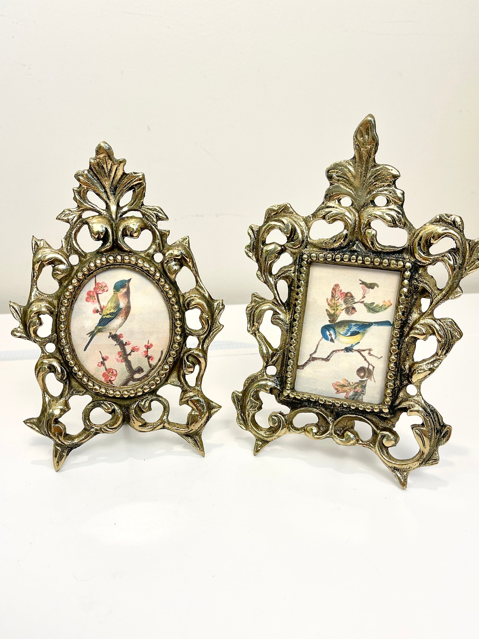 Pair of brass frames with elaborate scrolls and detail and pretty beading around the bird illustration. One is an oval, the other a rectangle. Each has a picture of a sweet bird on a branch under glass which can be changed as one wishes because the backs come off. These are standing tabletop frames and held up with an easel type back. The wooden pieces behind the pictures are held on with brass holders and screws.