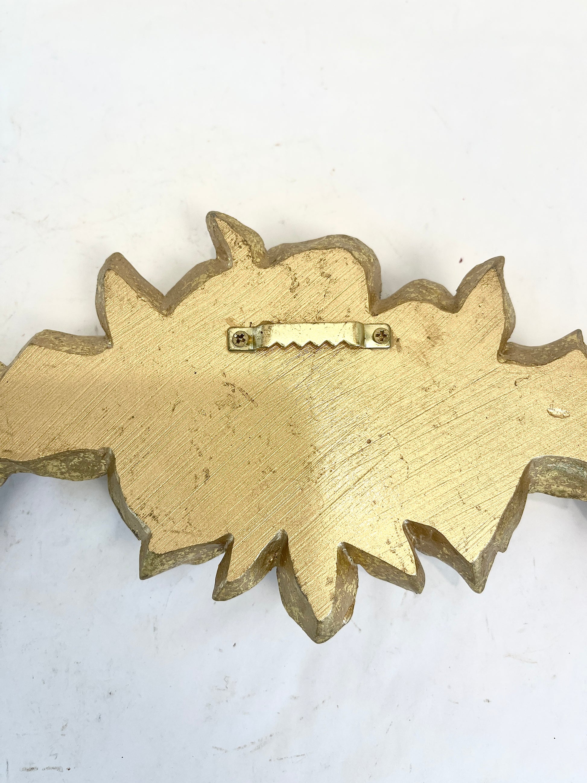 It’s a pretty swag of gilt magnolia blossoms and leaves. We believe it is wood, but it could be a heavy resin. Either way, it’s a lovely vintage piece. It’s in near perfect condition and is ready to hang with a sawtooth hanger on the back.