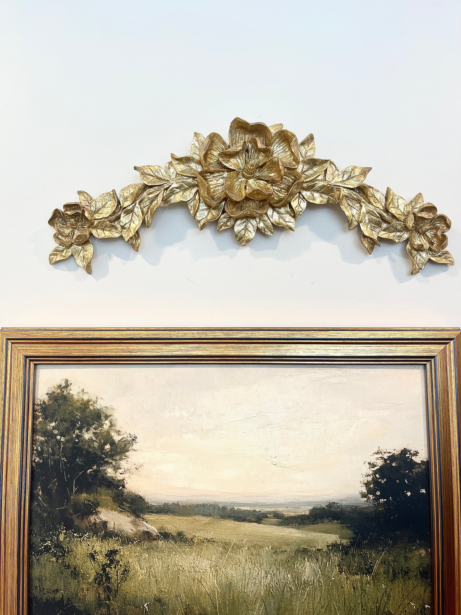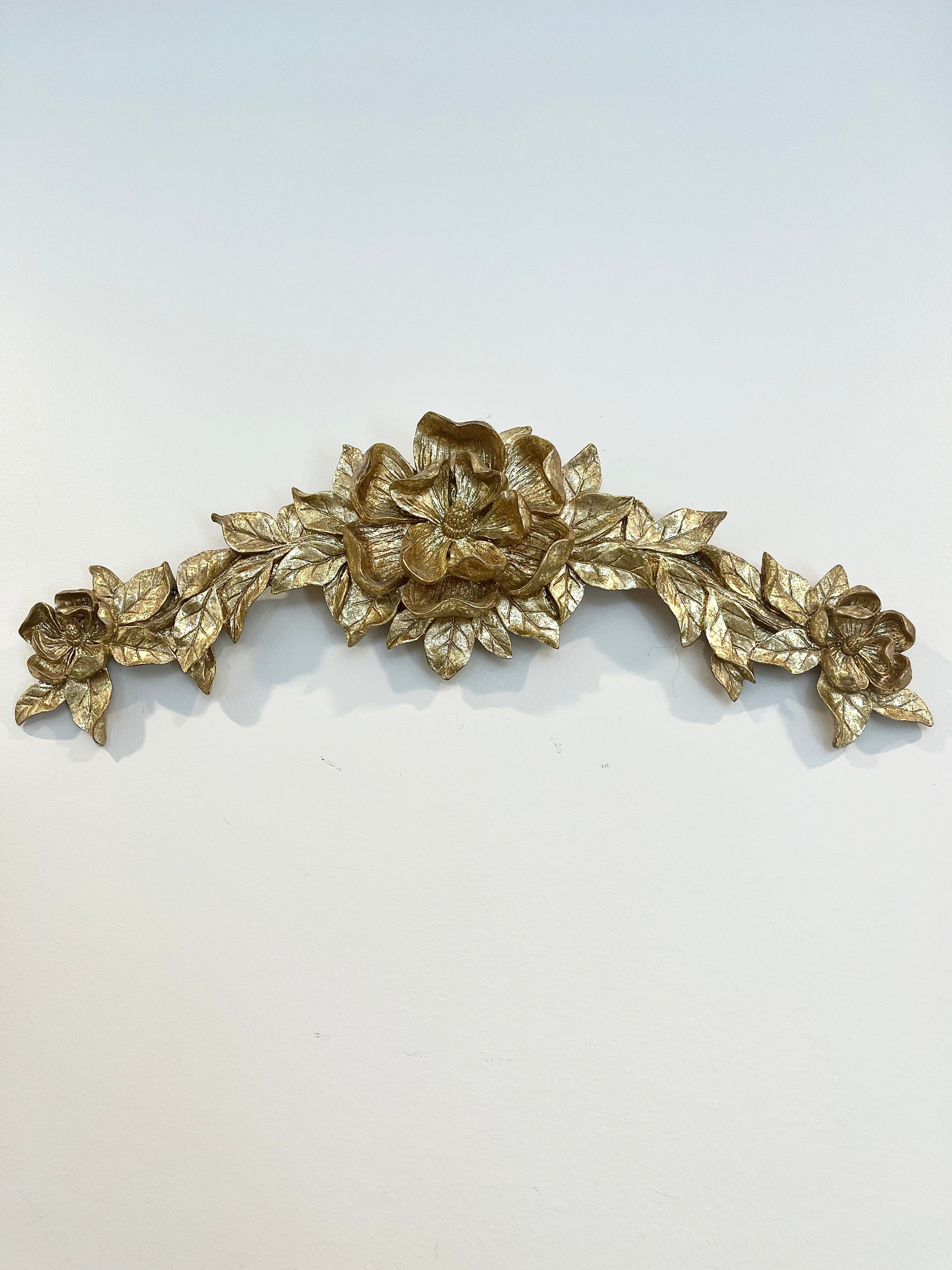 This decorative vintage piece adds a lovely touch to any room. The artfully carved flowers and leaves give a sophisticated look to doorways, over paintings, added to gallery walls or by itself as a beautiful touch of gold.