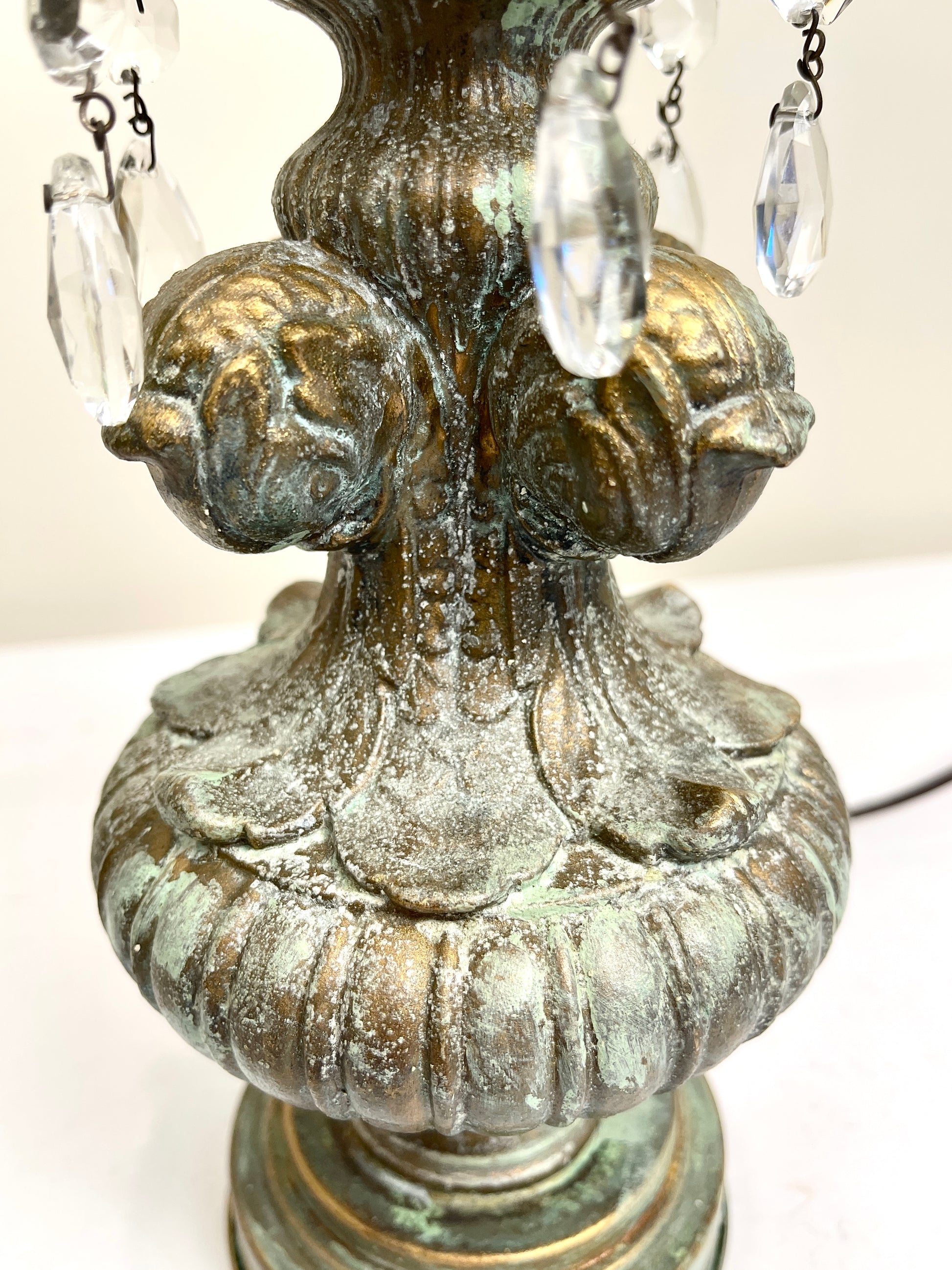 Ornate vintage metal lamp with a verdigris finish and subtle gold highlights to mimic aged copper or bronze. The base has baroque style detail topped off with a circle of leaves which hold five hanging crystals. A sixth crystal is missing. It still shows well with just the five but If one wishes, the crystals could be left off.