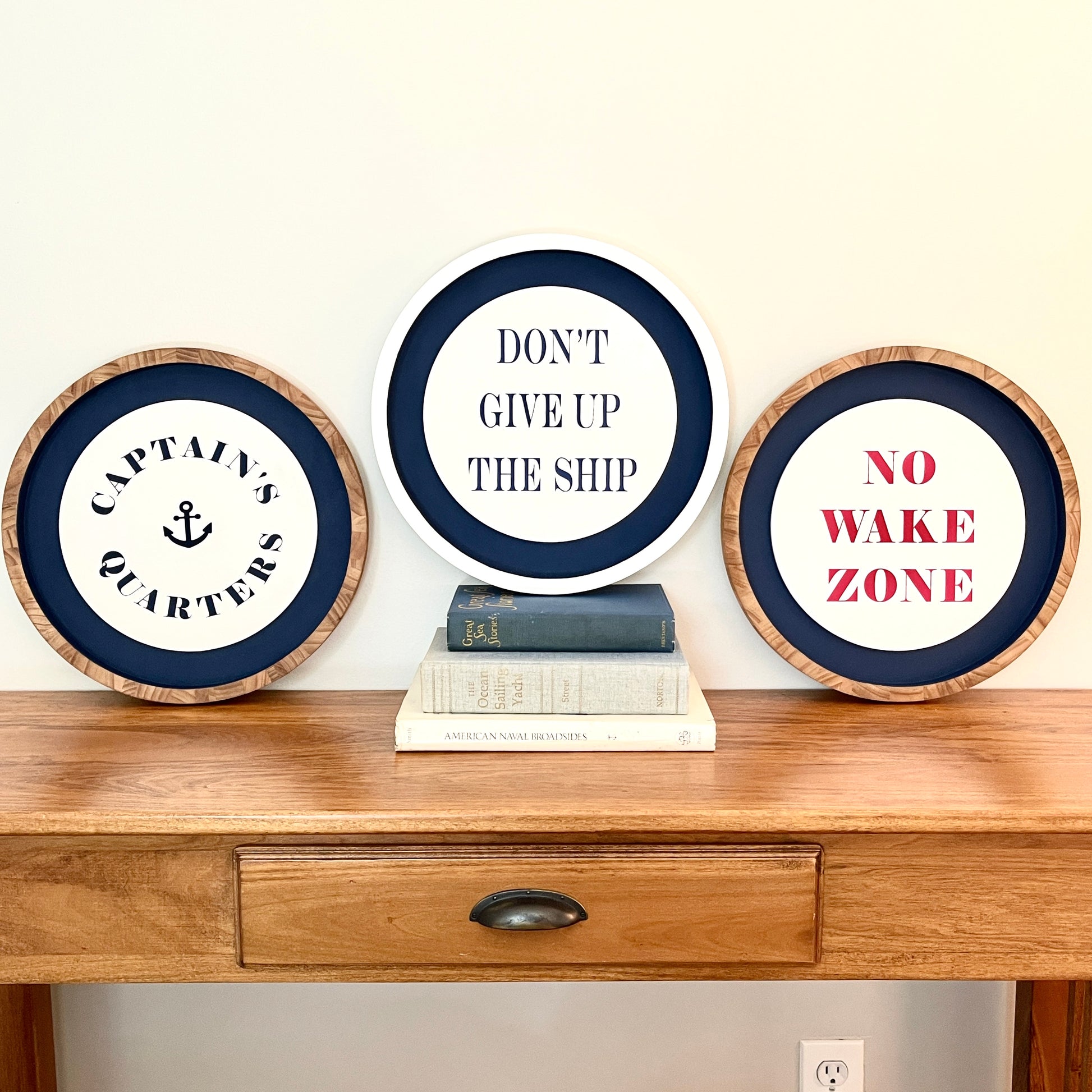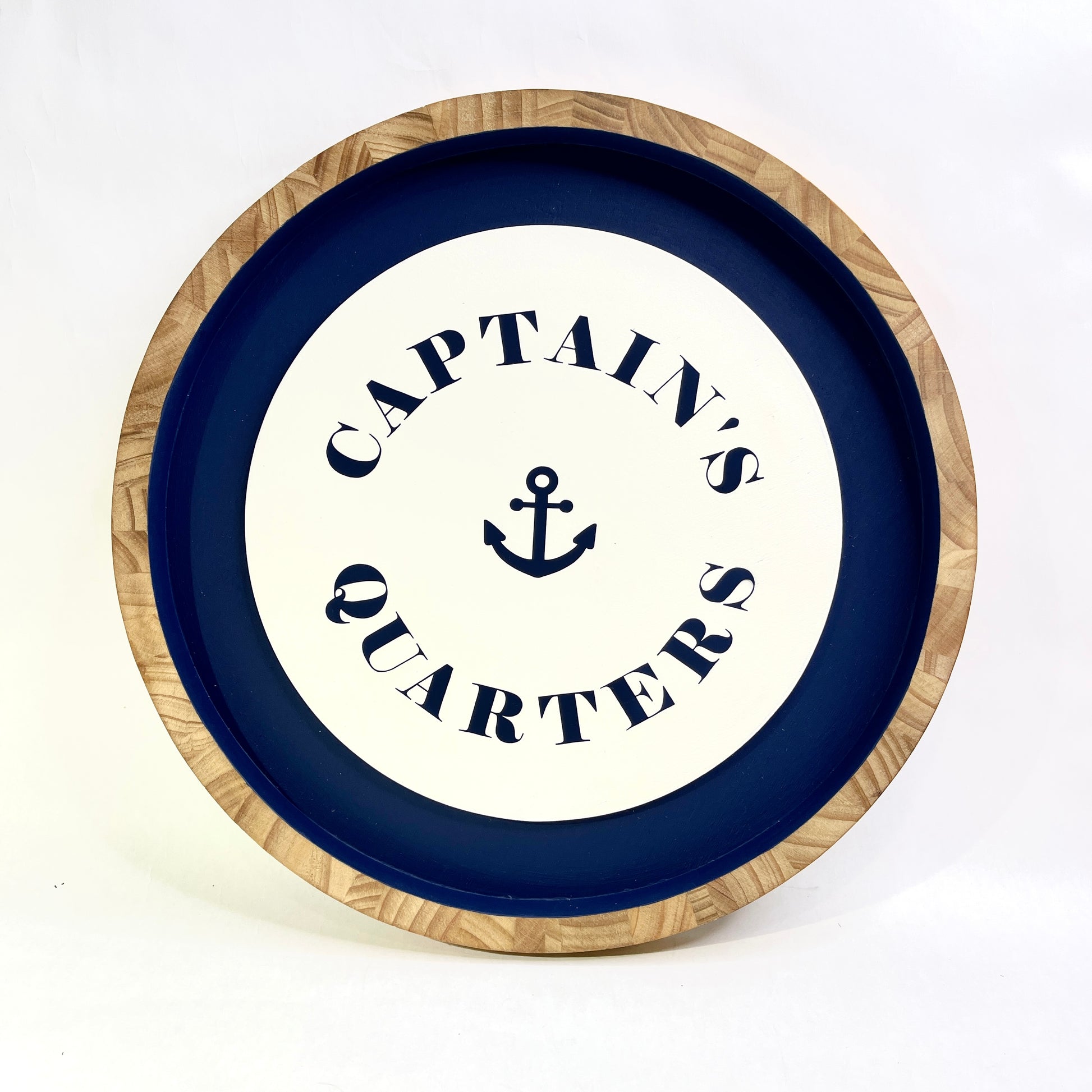 This handcrafted round wood nautical sign brings a touch of coastal charm to any space. The sign features a 14-inch wood round with a raised dark-stained edge in a walnut color. There is a white 10-inch wood round on the interior with the words Captain’s Quarters and an anchor. The background is navy blue to match the lettering.