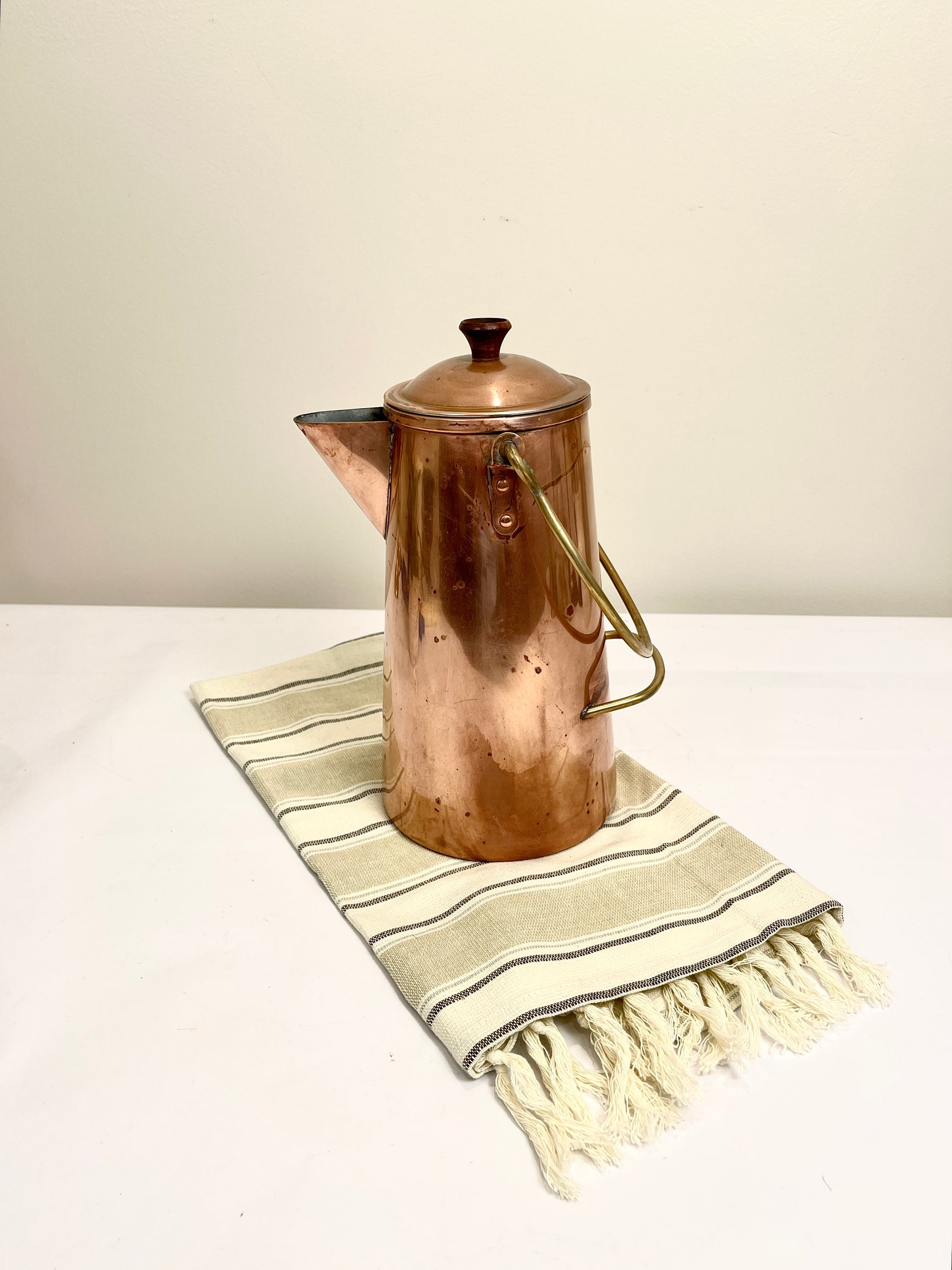 This is a very nice vintage copper coffee or tea kettle. It has a tin lining in good condition, a removable lid with a wooden knob and 2 brass handles. One handle is a swing style and the other is stationary. This style of pot is sometimes called a 'Cowboy coffee pot' as it's easy to hang over a campfire.