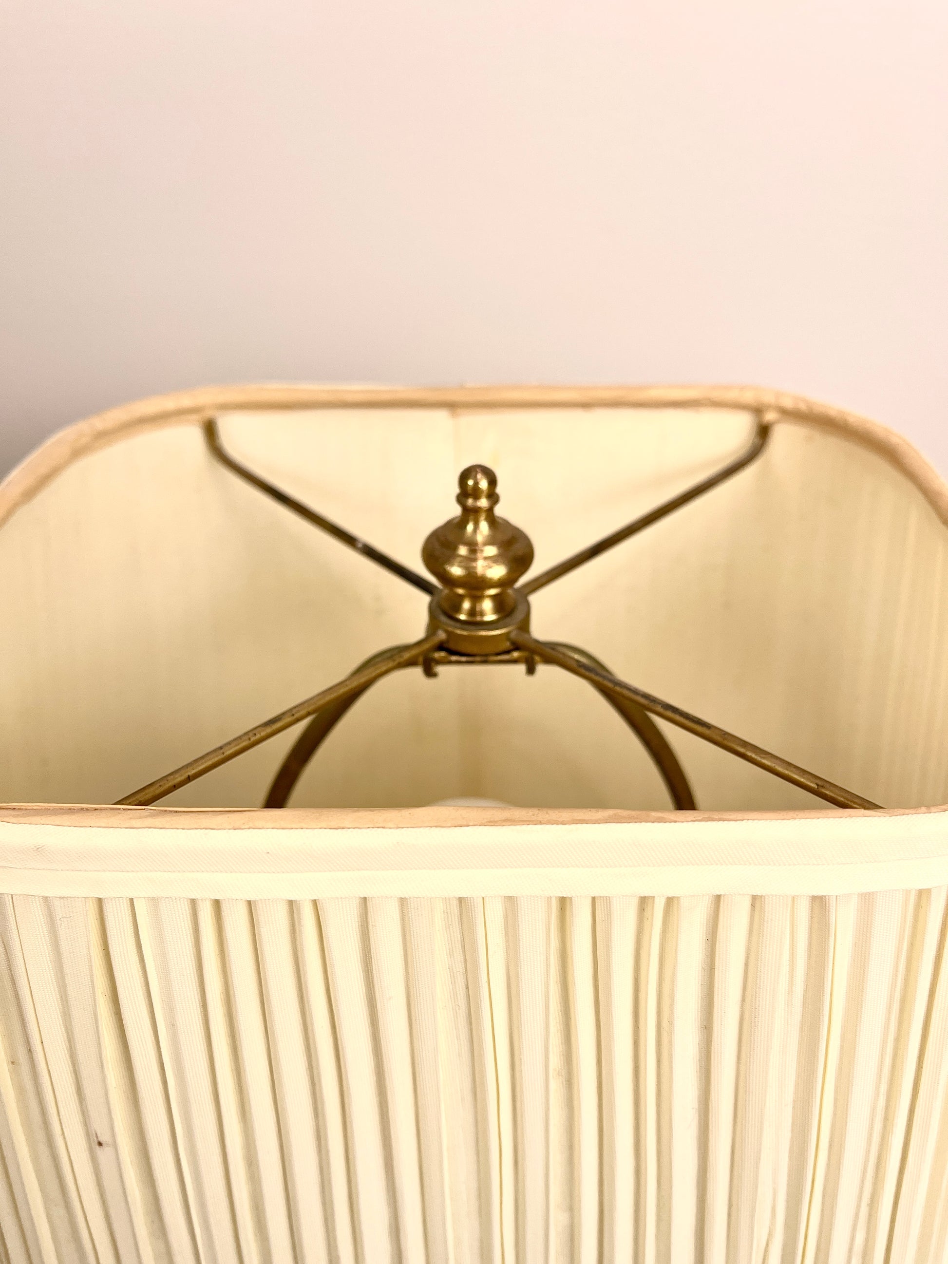 Brighten your space with this stunning vintage square-bodied porcelain lamp that sits on a solid wood base. A beautiful peacock sits amongst blooming branches – the same design adorns both sides of the lamp with a spray of blossoms outlined in gold on the sides and top. The floral colors are reds and pinks with a pretty band of muted red and gold at the top. The pleated shade which is topped with a brass finial is in good condition and will come with the lamp. It is no longer pure white but it could easily be changed for a shade of your choice. The harp and shade will be disassembled for shipping.