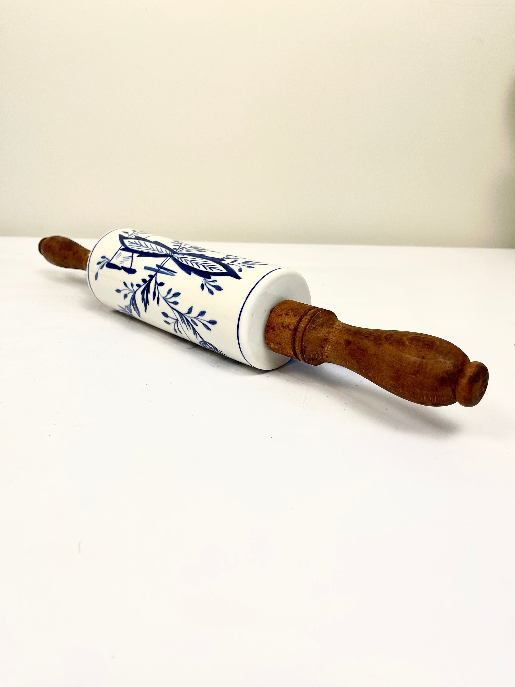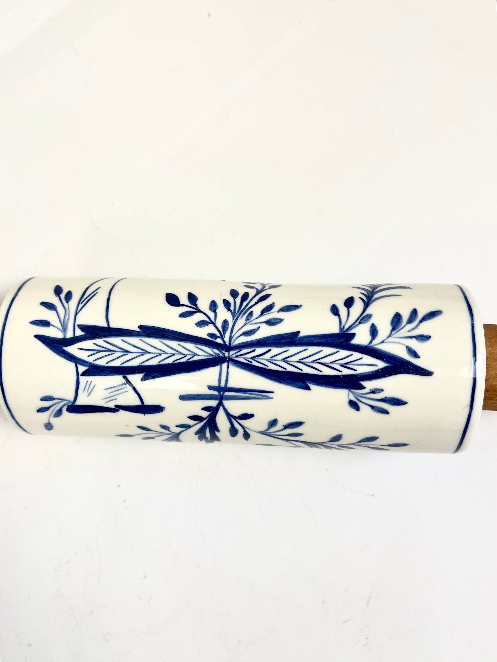 Very pretty vintage or antique rolling pin features a center porcelain roller embellished with blue flowers, leaves and vines on a glazed white background. Both ends are finished with turned wood handles. This is a beautiful collectible, representative of an era when rolling pins were both functional and decorative. The porcelain body makes it excellent for rolling pastry dough, while the striking blue-and-white pattern lends itself beautifully to display as a farmhouse or kitchen accent.
