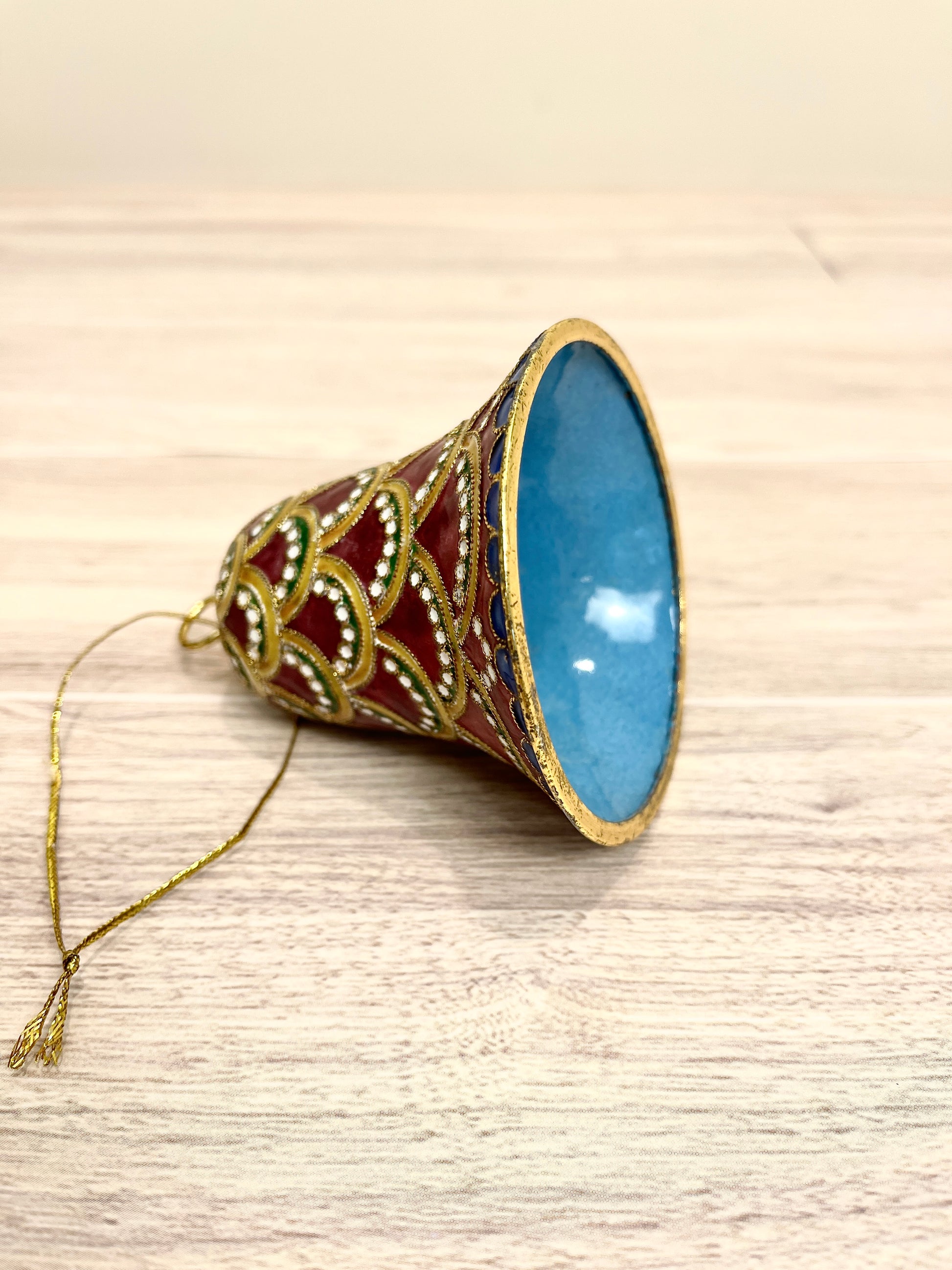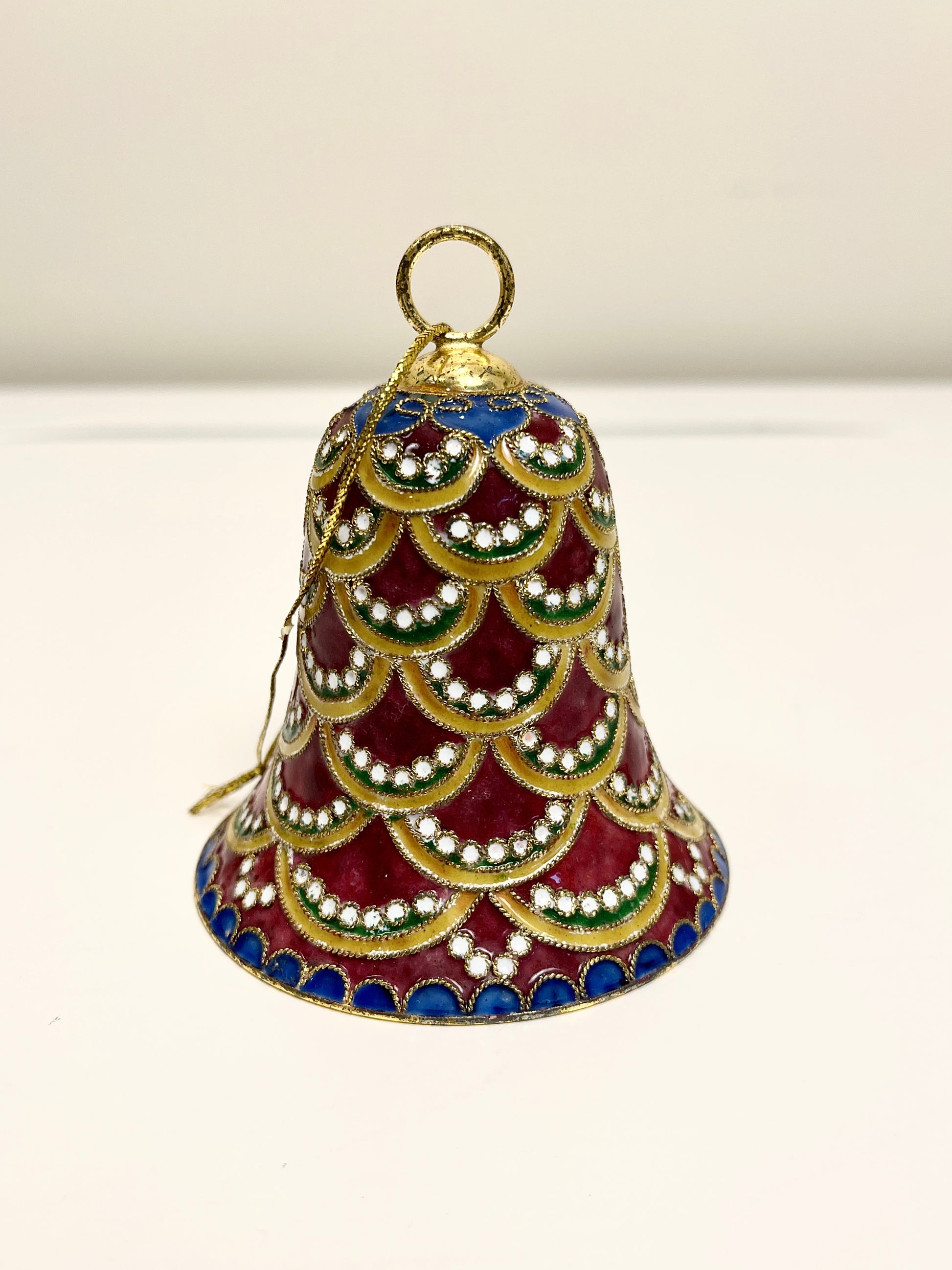 Very pretty vintage cloisonne bell with a lovely scalloped pattern. Cloisonne is an ancient and beautiful metalworking technique that fills small metal strips with colored enamels. The bell is brass at the top with a brass ring for hanging. The remainder is in rich hues of blues, muted reds, whites and golds. The inside is the traditional blue of cloisonne – it’s a very charming and interesting piece.