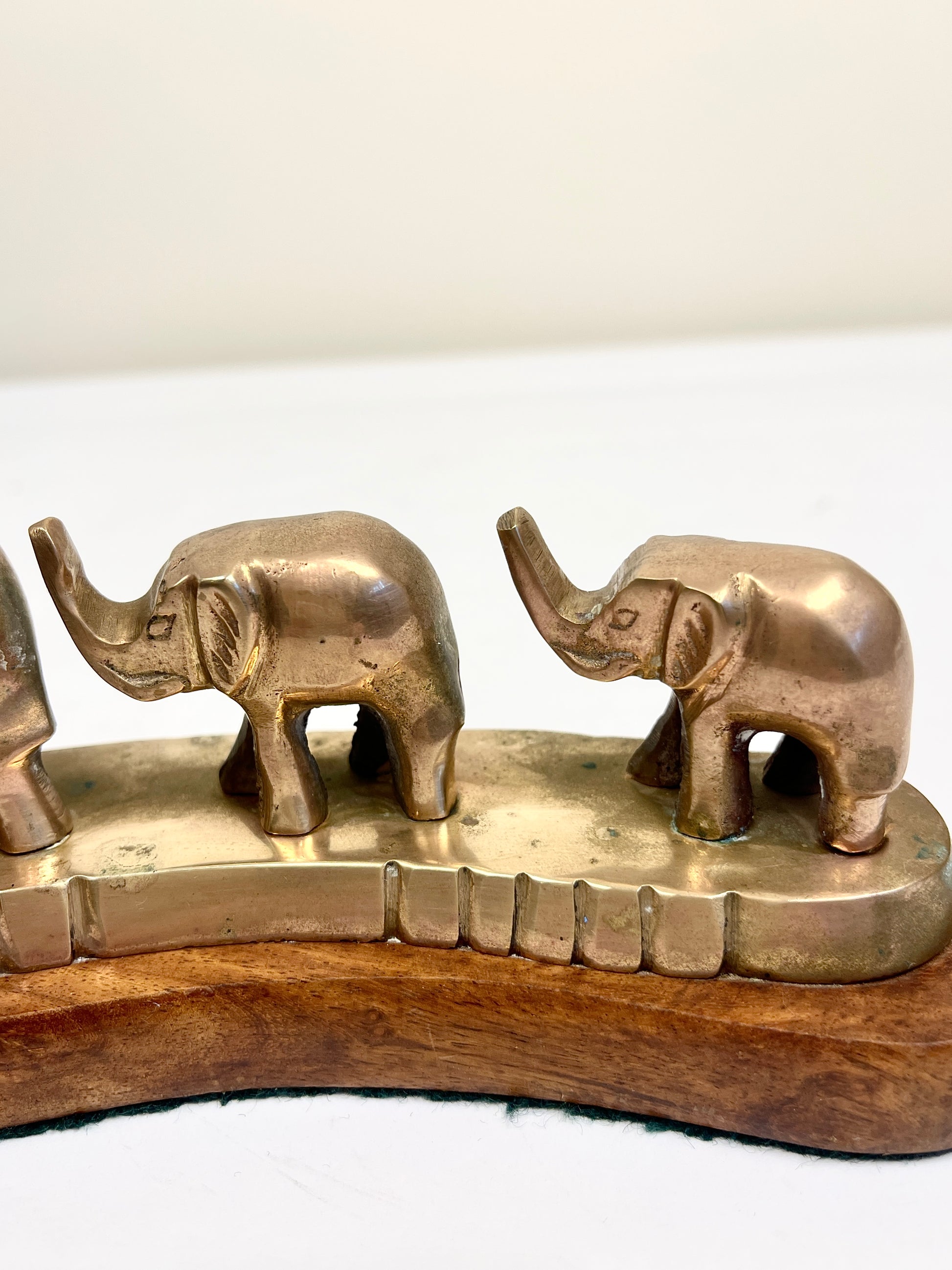 Pretty family of 3 vintage brass elephants mounted on a piece of curved wood. The brass has a nice patina but as with any vintage brass, it does show some minor signs of wear. The wooden base is made of pretty dark honey color wood and is in wonderful condition. There is felt on the bottom to protect a tabletop.