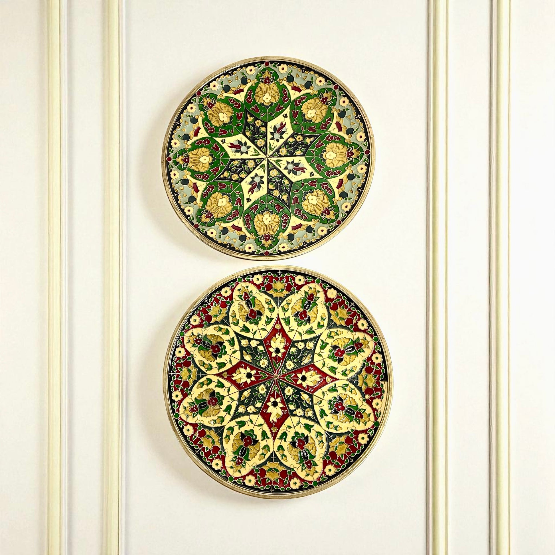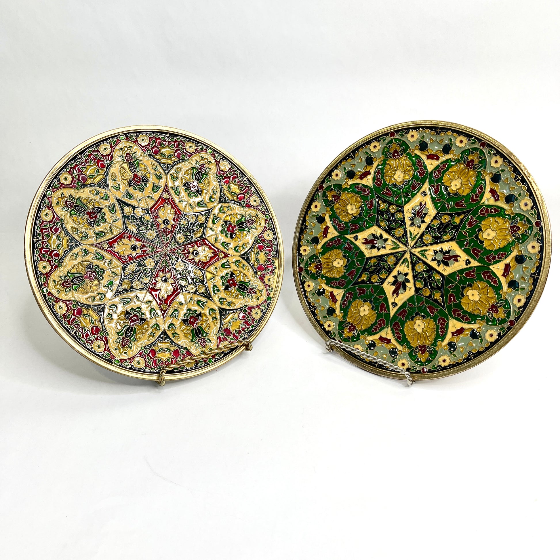 Beautifully crafted and very unique vintage round brass wall decor with intricate and colorful enamel cloisonne designs. Price includes two. Cloisonne is a lovely, hand crafted art form with great attention to detail. The colors are reds, greens and creams and can be hung together or separately. If hung together, the colors complement each other beautifully.
