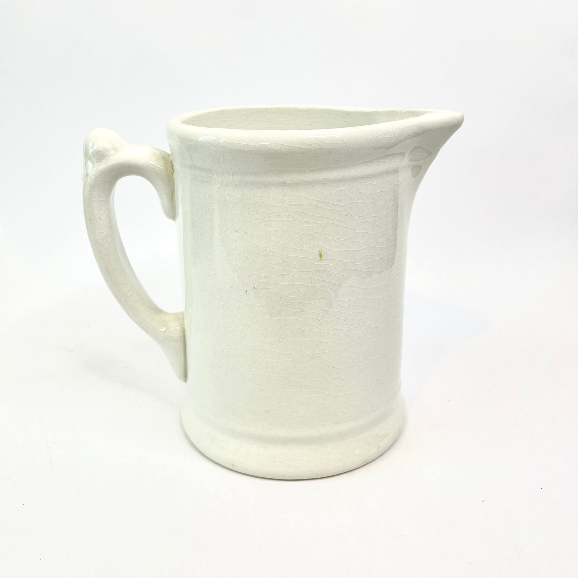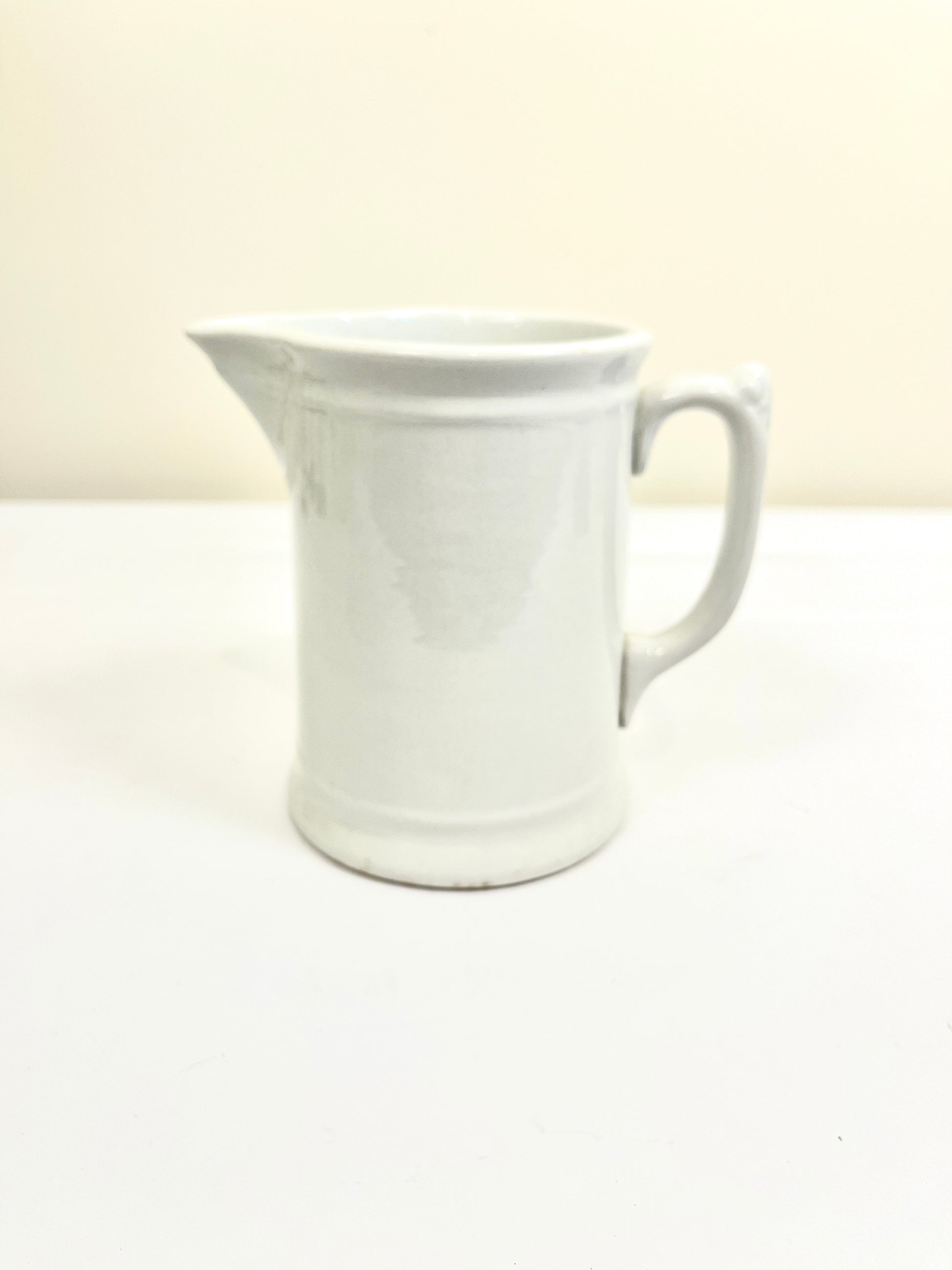 Lovely vintage white pitcher has clean lines and is in very nice, very clean condition. Sturdy and a good weight, it is perfect for use at your table, for flowers, kitchen utensils or just as a charming addition to your pitcher collection. This "could" be ironstone but it is not marked as such.