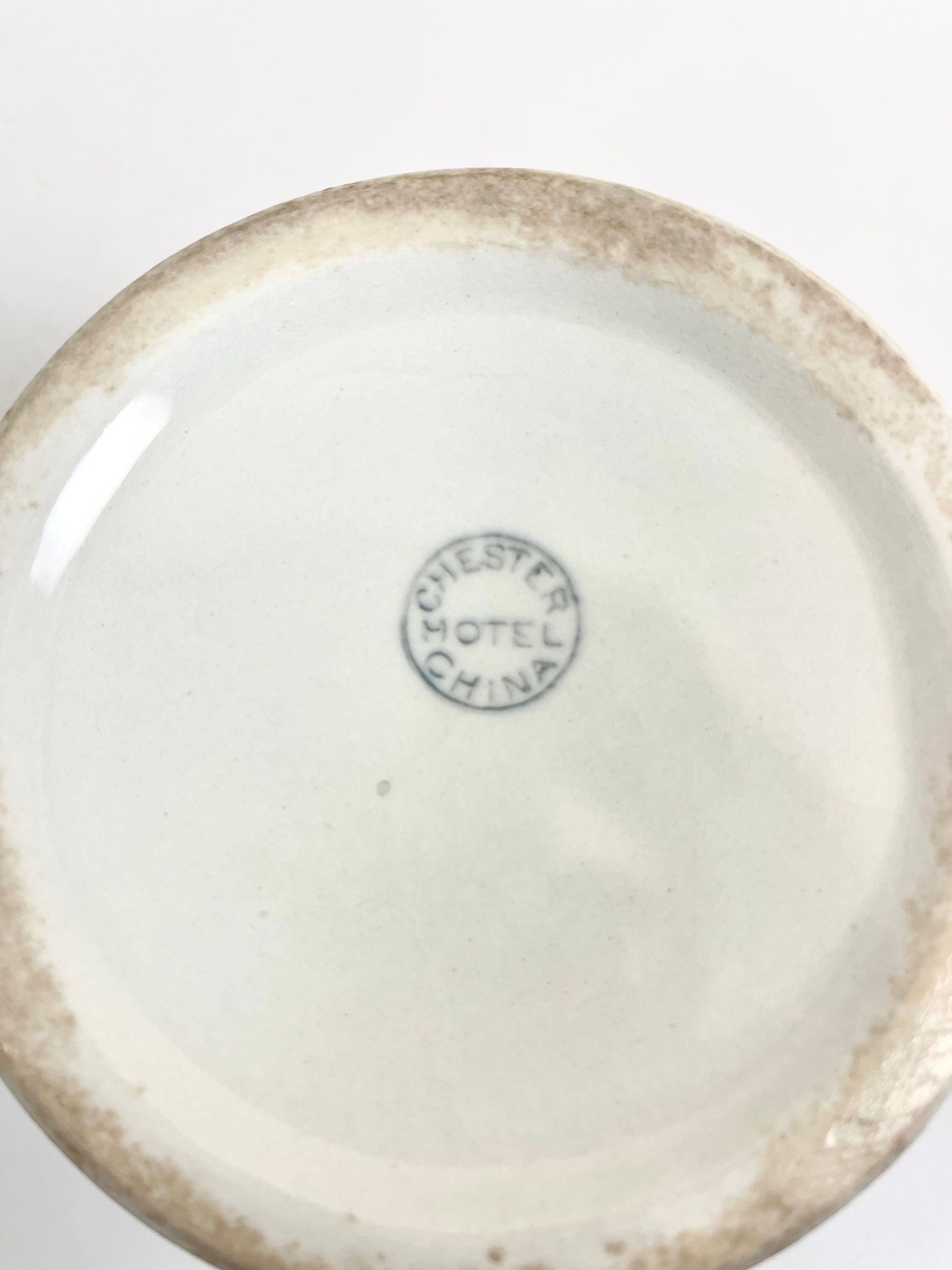 There is no crazing, chips or cracks that we have been able to detect. There are some very small marks in the glaze along the bottom but it still shows beautifully. There is a backstamp on the bottom which reads “Chester Hotel China”.