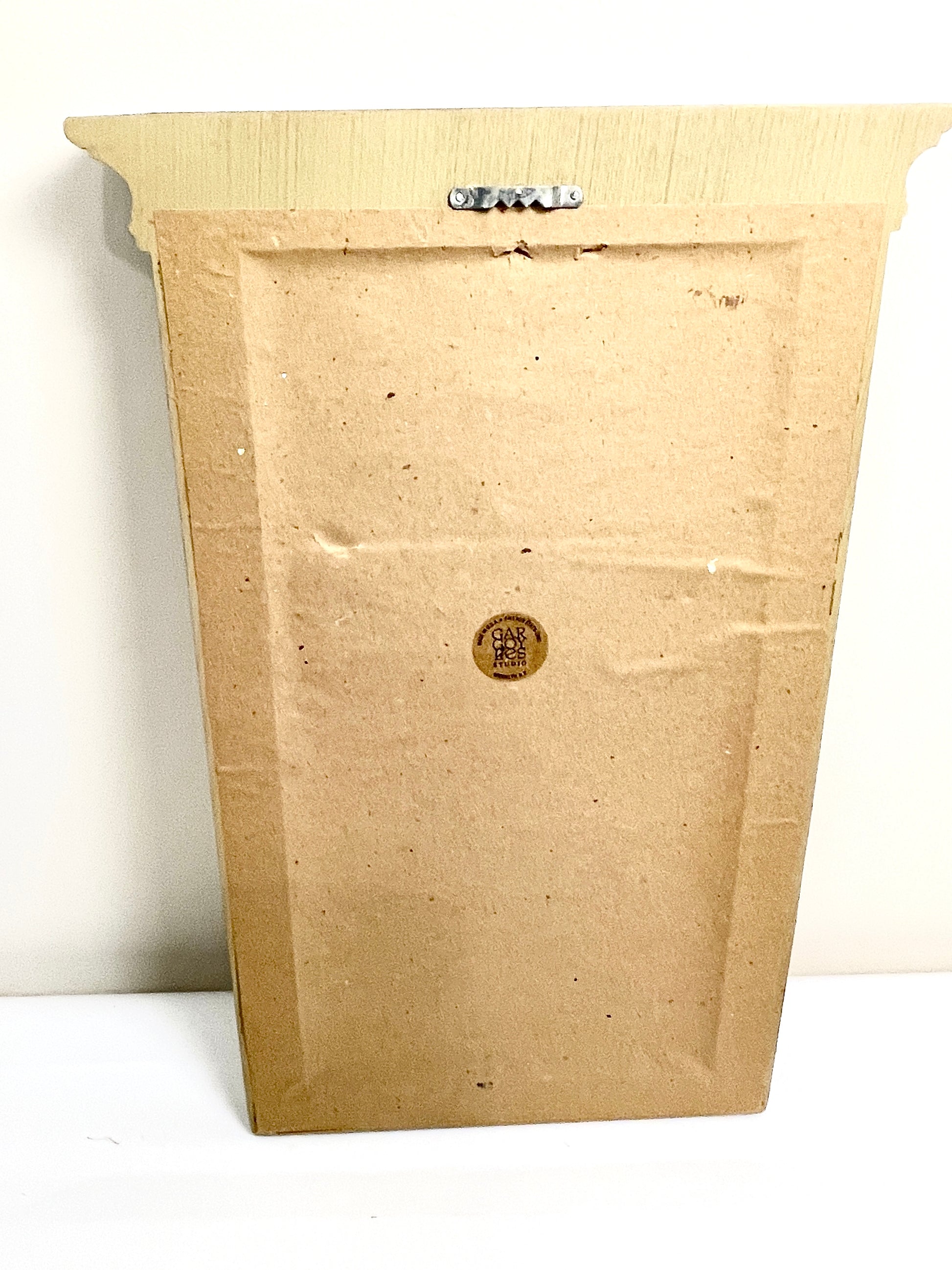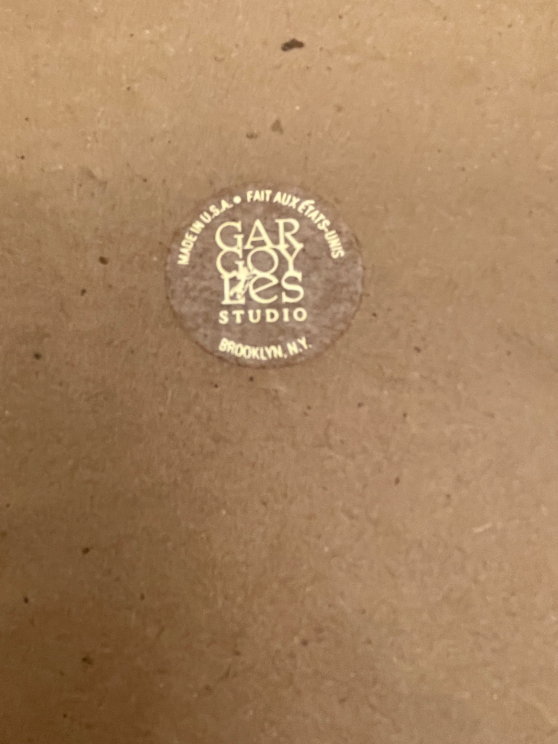 It's made by Gargoyles Studio of Brooklyn, New York and still has the original label on the back. There is a wall mount hanger and the backing is paper that is still firmly attached.
