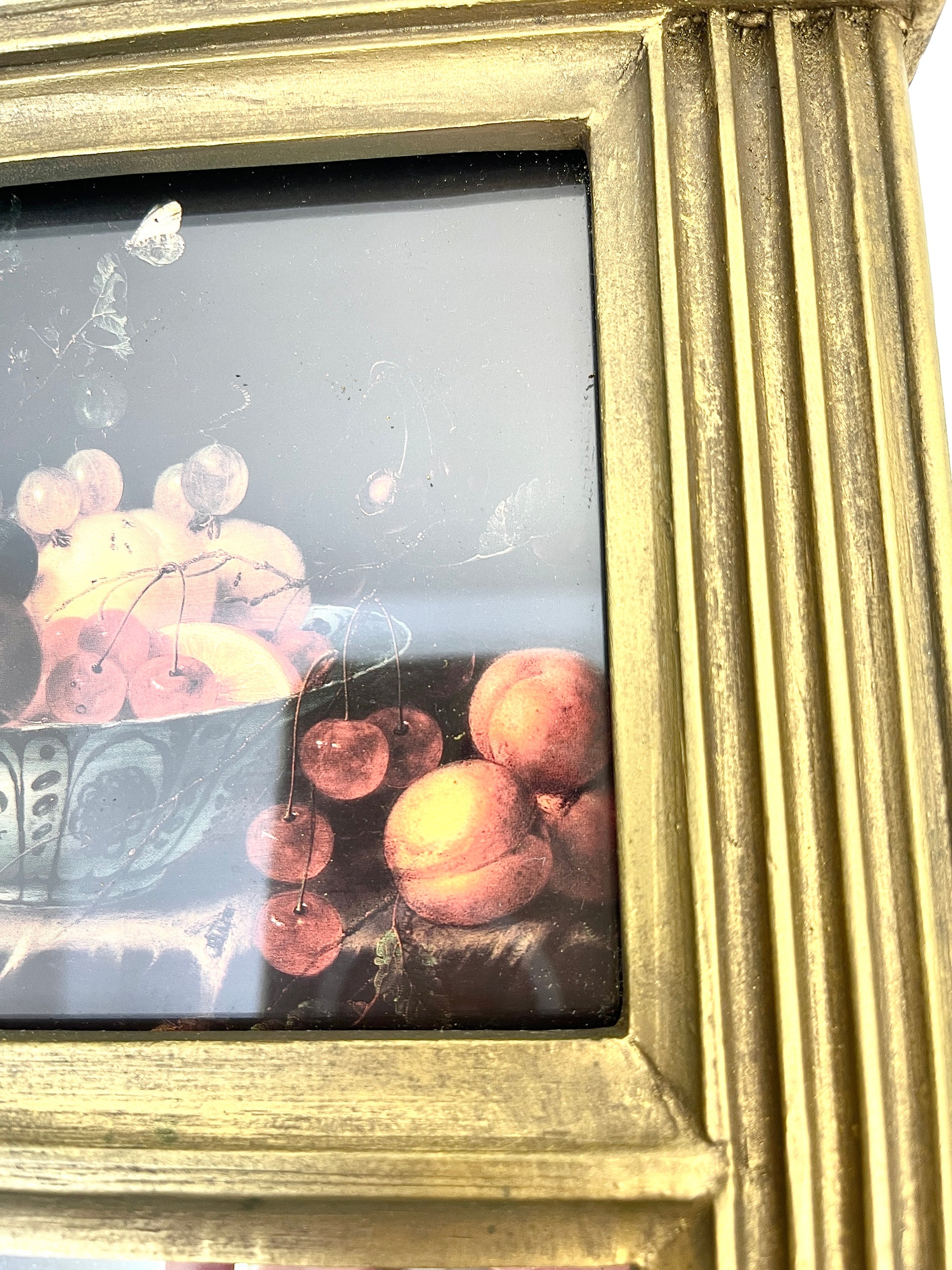 Lovely vintage accent mirror in the Trumeau style. The bottom two thirds is a mirror and the top features a beautiful still life of fruits on a black background. The fruits are in a decorative bowl and have butterflies skimming over the top. It's very pretty and in excellent condition.