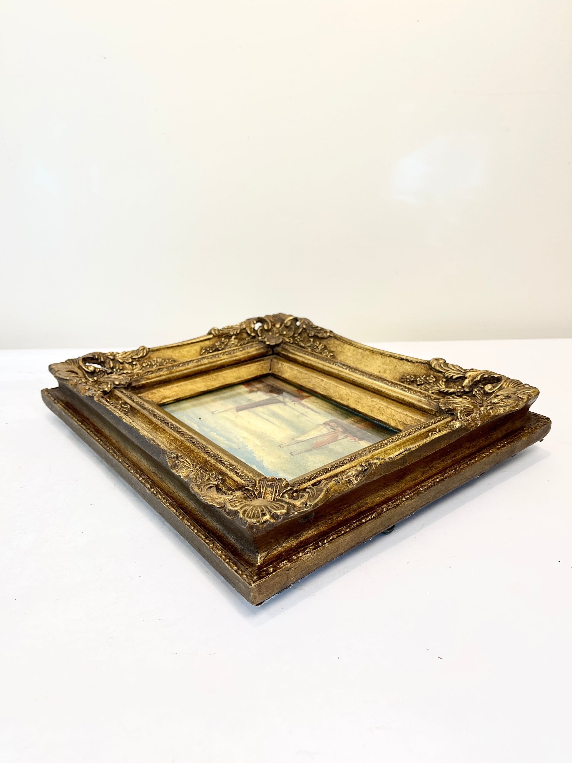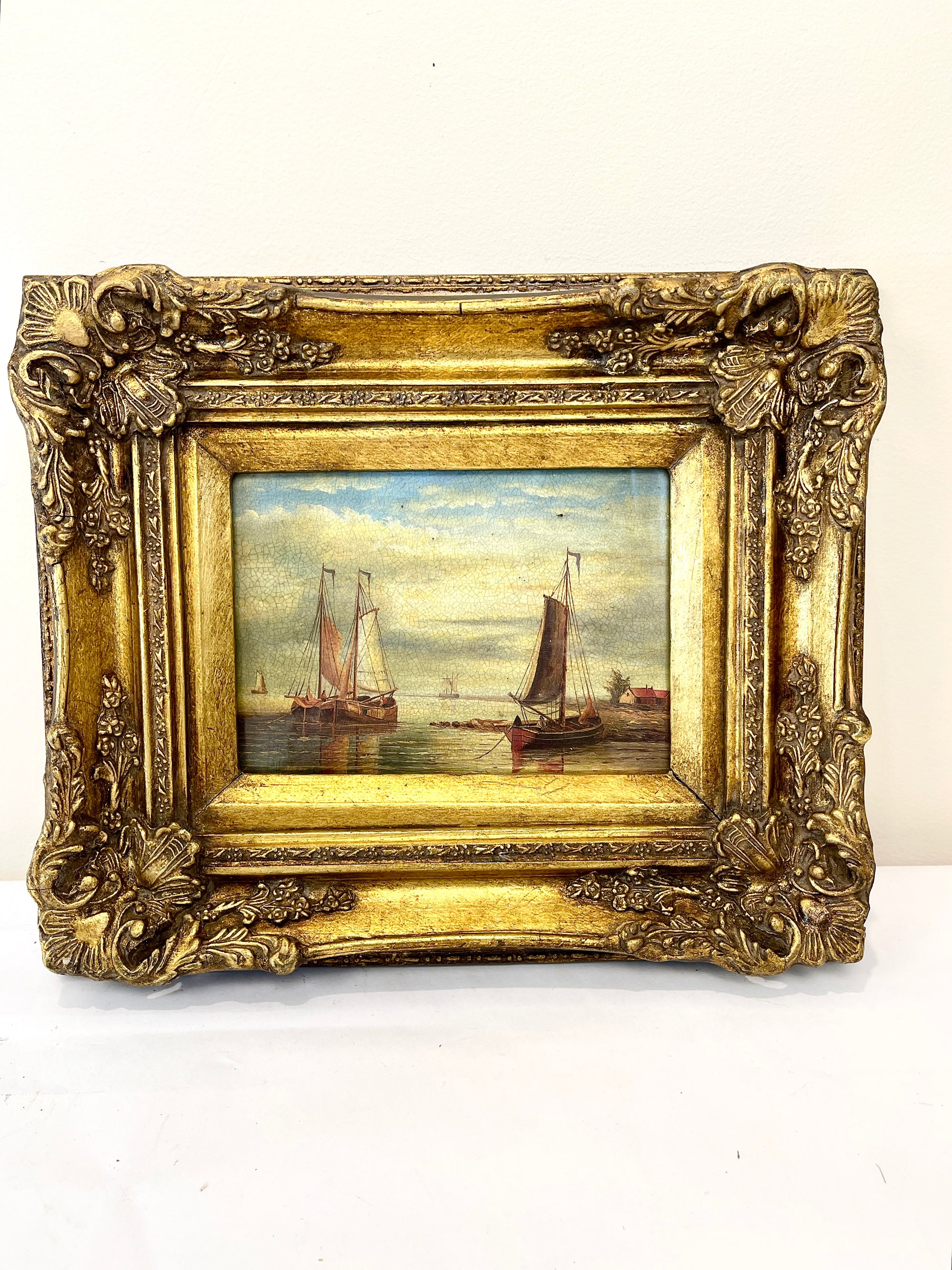 Beautiful vintage or antique oil on board painting depicting two sailboats in a substantial and ornately carved gold wood frame. The painting is covered in glass and is a moody and muted scene in creams, reds, soft blues and greens. Lovely in almost any decor.