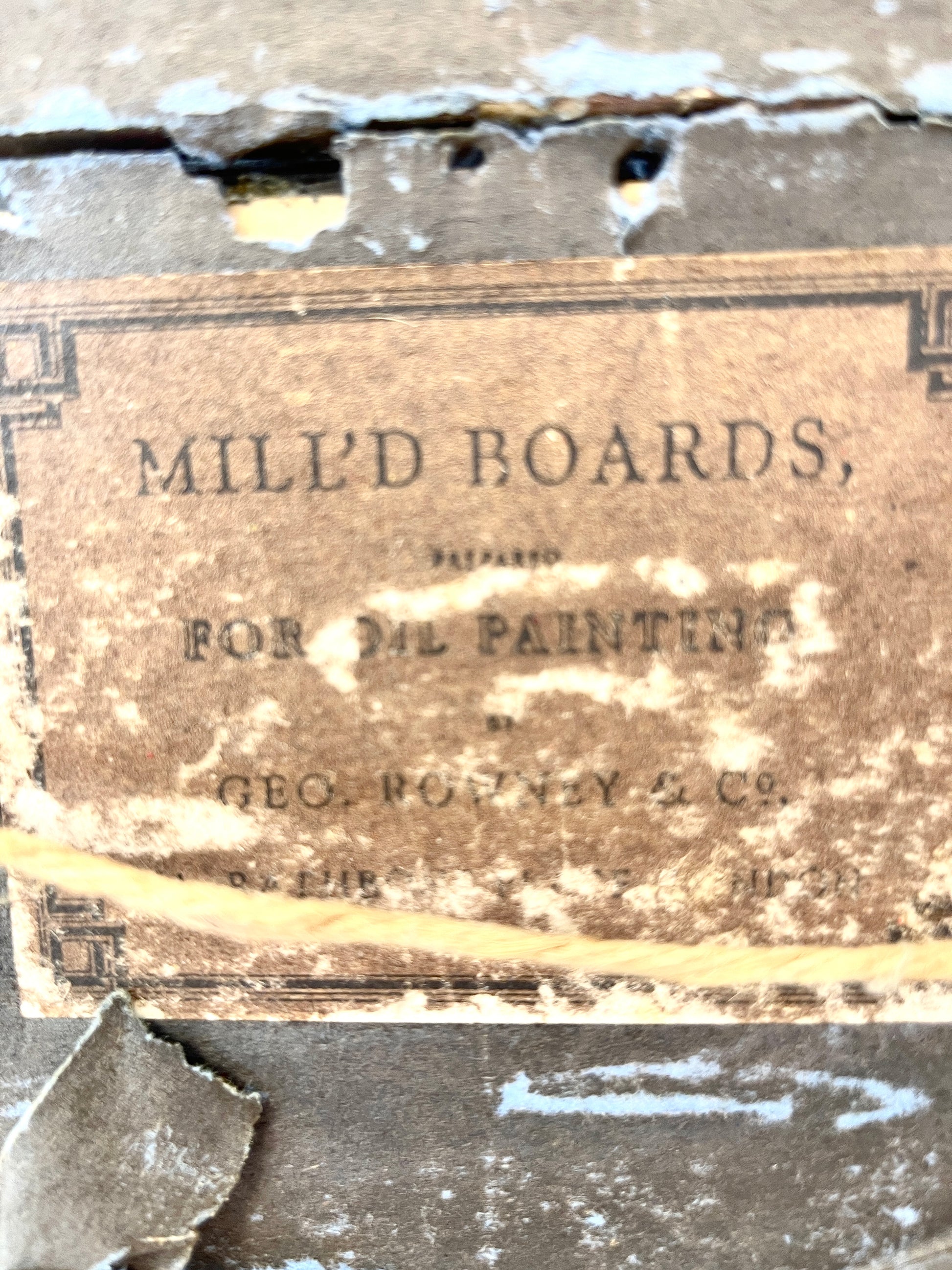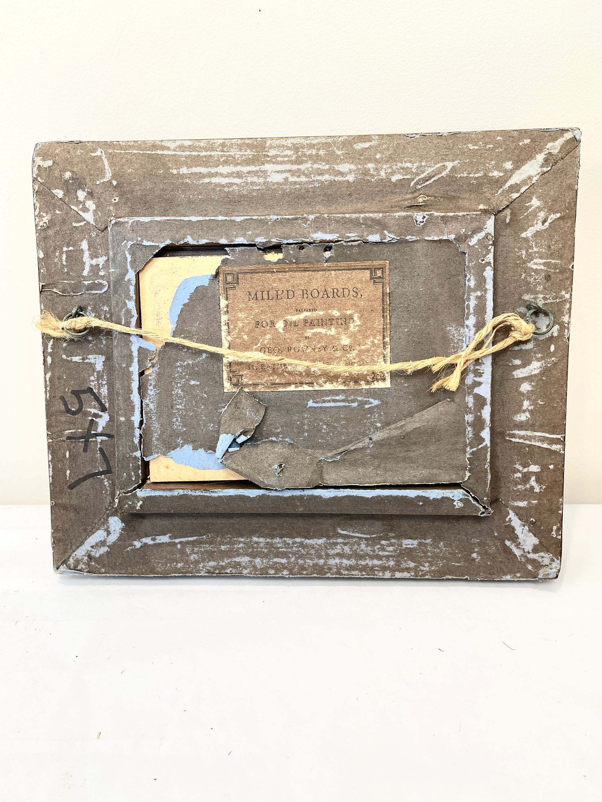 The painting is in very good condition. The frame is in excellent condition, beautifully carved and loaded with detail. It shows very little wear and makes an elegant statement. Ship decor is always in style. The back side shows the most wear and has an original label and rope hanger. The label reads " Mill'd Boards Prepared for Oil Paintings - Geo. unreadable and Co." The remainder is unreadable.