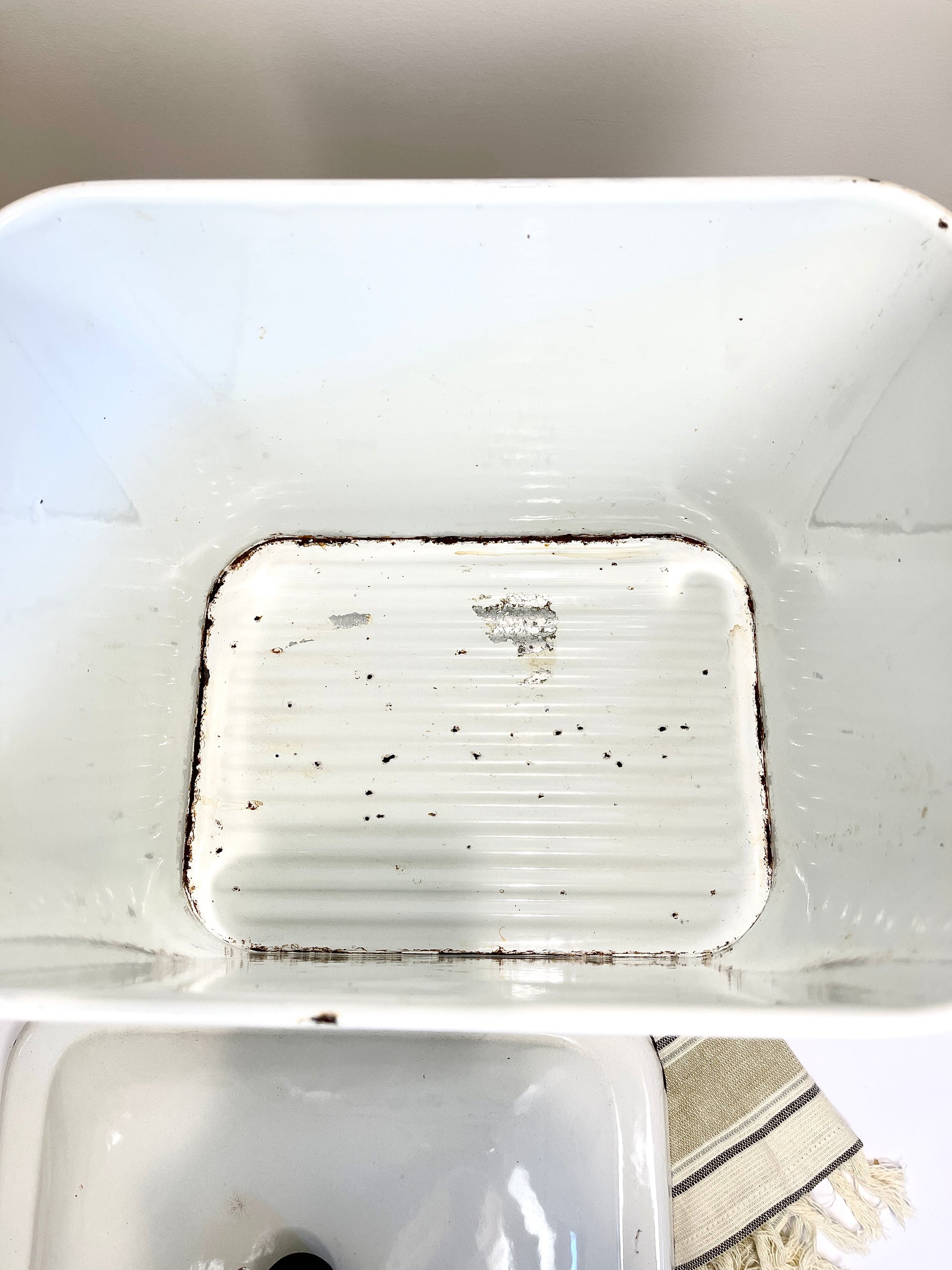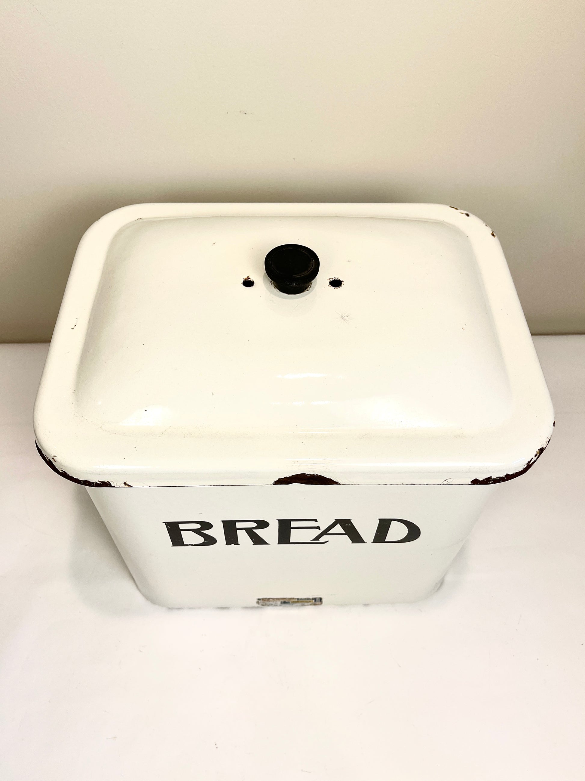 This is a charming vintage enamelware bread box. It's white with the word BREAD in black lettering on the front. There are two handles that are white with a dark navy color in the middle, two vent holes in the lid, a black Bakelite knob handle and the original label near the bottom. Most of the label is not readable except for the words “Porcelain and Regina”. The bottom has ridges which we assume help keep the bread up off the bottom and therefore fresher. As we were leaving the antique store with this piece, a customer who was walking in pointed to the breadbox and said, I just bought one of those for myself and they really do work – it kept my bread fresh for well over a week!